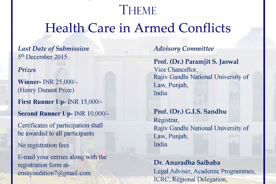 Rajiv Gandhi National University of Law, Punjab is pleased to announce 7th Edition of South Asian Essay Writing Competition on International Humanitarian Law- Ensayo 2015 organised by Centre for Advanced Studies in International Humanitarian Law (CASH) at RGNUL, Punjab in collaboration with International Committee for Red Cross, Regional Delegation, New Delhi, India.