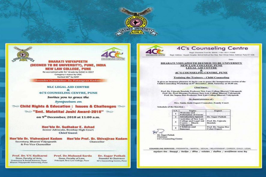 New Law College, Bharati Vidyapeeth University’s Legal Aid Centre and 4C’s Counselling Centre, Pune organising the Child Counselling Workshop. It is scheduled to be held today i.e December 8, 2018, with Prof Dr Ujjwala Bendale, Prof Dr Jyoti Sharma, and Prof Dr Sapna Deo as Honorary chief guests.