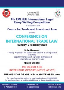 The Journal Committee at Dr. Ram Manohar Lohiya National University, Lucknow, in collaboration with Centre for Trade and Investment Law, Indian Institute of Foreign Trade is organising RMLNLU- CTIL Conference on International Trade Law (7th RMLNLU International Legal Essay Writing Competition) on February 02, 2020.