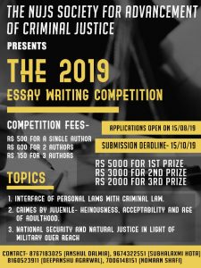 The Society for Advancement of Criminal Justice (SACJ) at West Bengal National University of Juridical Sciences (WBNUJS), Kolkata, is conducting its annual flagship event, the 6th NUJS-SACJ National Criminal Law Essay Writing Competition, 2019.