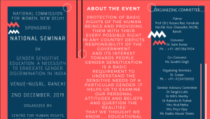 The Centre for Human Rights and Subaltern Studies (CHRSS), National University of Study and Research in Law, Ranchi is organizing a National Seminar on GENDER SENSITIVE EDUCATION: A NECESSITY TO ERADICATE GENDER DISCRIMINATION IN INDIA sponsored by National Commission for Women.