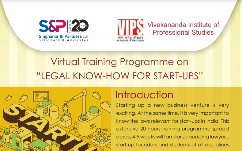 Virtual Training Programme on “Legal Know- How for Startups” by Singhania & Partners LLP in collaboration with Vivekananda Law School, Vivekananda Institute of Professional Studies, Delhi [26th June, 2020 to  31 July 2020.]