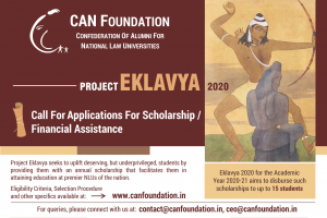 Primarily, the Minimum Eligibility criterion for attaining the scholarship benefit under Project Eklavya requires the student to be of an NLU undergrad with a minimum of 65% aggregate/average marks in the last three semesters. The Annual Cumulative Family Income (of Father, Mother, unmarried brother or sister) shall not exceed Rs. 8,00,000 per year including the current financial year. The detailed Application Form with the instructions for Project Eklavya 2020 is available and can be accessed at the official website of CAN FOUNDATION ( HERE).