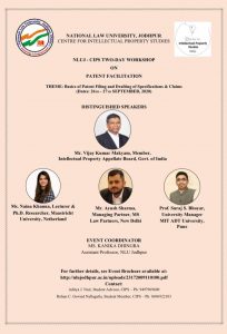 The Centre for Intellectual Property Studies at NLU, Jodhpur (“CIPS”) is organising a Two-Day Workshop on “Patent Facilitation” covering the aspects of Patent Basics, Filing of Specification and Claim Drafting.
