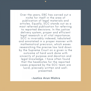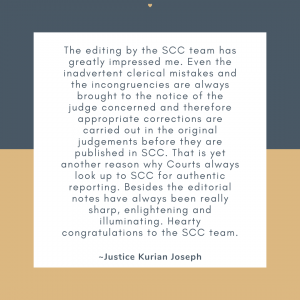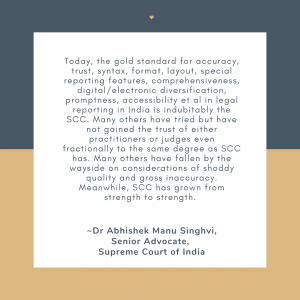 Over a period of time, Supreme Court Cases has earned an enviable reputation of being the most accurate and reliable reporting of law in India. This reputation has been painstakingly built over years of hard work and quality control. Eastern Book Company, the parent company of SCC, was established in 1942 by Mr. CL Malik and PL Malik and the baton to lead the organisation was subsequently passed on to Mr Surendra Malik. Over the span of 50 years, he has held a tight leash over the quality of law reports and digests produced by EBC. So particular is Mr Malik about his workmanship, that every single judgment published by SCC has 27 copy-editing inputs in order to make it as readable and user-friendly as possible. It can be safely said that till a couple of years ago he had read almost every judgment delivered by the Supreme Court of India.