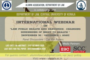 Department of Law, Central University of Kerala (Thiruvalla Campus) in collaboration with Alumni Association is organising an International Webinar on LAW, PUBLIC HEALTH AND PANDEMICS: CHANGING DIMENSIONS OF RIGHT TO HEALTH on 30th November to 1st December 2020. The two days Webinar includes panel discussion amongst eminent experts in the field and paper presentations.