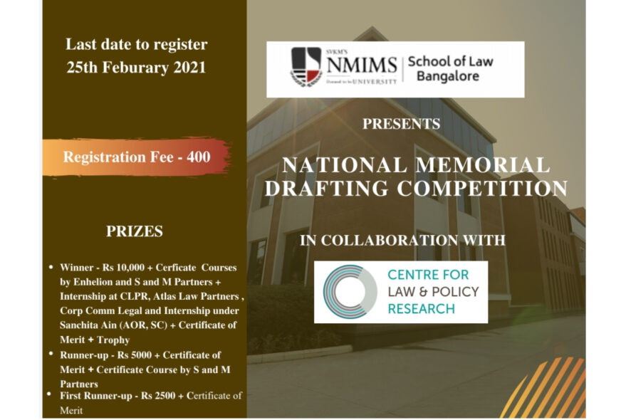 Nations across the world are bearing up their preparation to face the challenges thrown by the Coronavirus. India is also following the impeccable measure of social distancing. But at the same time, we are not standing apart; rather technology has enabled us to maintain our life in both social as well as professional spaces. With the help of this technological advancement The Moot Court Society of NMIMS School of Law Bangalore feels honored and proud to organize its 1st National Memorial Drafting Competition 2021 in collaboration with Centre for Law and Policy Research.