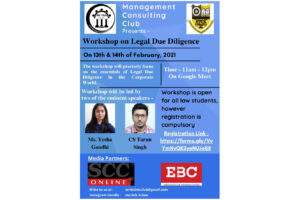 On 13 & 14 February 2021, the FREE “Two Day Legal Due Diligence Workshop” is being organized by the Management Consulting Club, popularly known as MC Club. MC Club is a student-run initiative, by the students of K. C. Law College.
