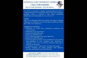 The NLUO Law Journal (ISSN 2348-8913), first published in 2013, is the flagship publication of National Law University Odisha, with biannual issues promoting legal scholarship in national and international interdisciplinary legal issues. Past issues have been based on topical themes; however, this issue has no particular themes and all areas of law can be explored through submissions in the journal for this issue. The last themed issue was on ‘Migration and Human Rights: Issues, Trends and Challenges’. The NLUO Law Journal is published tentatively in the months of January and July every year and accepts submissions on a rolling basis from external contributors.