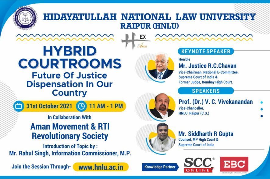 Raipur (C.G.)- Hidayatullah National Law University, Raipur shall be hosting a Virtual Session on ‘Hybrid Courtrooms: Future of Justice Dispensation in Our Country’ on 31st of October, 2021 from 11:00 AM to 1:00 PM. The session which is being hosted in collaboration with Aman Movement & RTI Revolutionary Society shall be having Mr Justice R.C. Chavan, Vice-Chairman, National E-Committee, Supreme Court of India & Former Judge, Bombay High Court as a Keynote Speaker, Prof. (Dr.) V. C. Vivekanandan, Vice-Chancellor, HNLU, Raipur and Mr Siddharth R Gupta, Counsel, MP High Court & Supreme Court of India as Guest Speakers. The topic shall be veering around the Contemporary Relevance & Necessity of Hybrid Model of Courtrooms in various Constitutional Courts of the country like the Supreme Court and High Courts as also various Tribunals like NCLT, NCLAT, NCDRC, and other such statutory forums. Hybrid Model refers to a system where a lawyer or a litigant can appear either through physical mode before the Court or may avail the Video Conferencing facility and appear virtually for conducting his case. In the COVID-19 Pandemic, all the High Courts were working virtually through Video Conferencing facilities, whereafter they shifted to the Hybrid Mode of hearing.