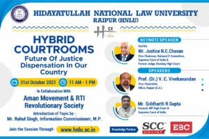 Raipur (C.G.)- Hidayatullah National Law University, Raipur shall be hosting a Virtual Session on ‘Hybrid Courtrooms: Future of Justice Dispensation in Our Country’ on 31st of October, 2021 from 11:00 AM to 1:00 PM. The session which is being hosted in collaboration with Aman Movement & RTI Revolutionary Society shall be having Mr Justice R.C. Chavan, Vice-Chairman, National E-Committee, Supreme Court of India & Former Judge, Bombay High Court as a Keynote Speaker, Prof. (Dr.) V. C. Vivekanandan, Vice-Chancellor, HNLU, Raipur and Mr Siddharth R Gupta, Counsel, MP High Court & Supreme Court of India as Guest Speakers. The topic shall be veering around the Contemporary Relevance & Necessity of Hybrid Model of Courtrooms in various Constitutional Courts of the country like the Supreme Court and High Courts as also various Tribunals like NCLT, NCLAT, NCDRC, and other such statutory forums. Hybrid Model refers to a system where a lawyer or a litigant can appear either through physical mode before the Court or may avail the Video Conferencing facility and appear virtually for conducting his case. In the COVID-19 Pandemic, all the High Courts were working virtually through Video Conferencing facilities, whereafter they shifted to the Hybrid Mode of hearing.