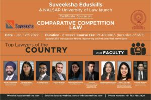 A certificate course on Comparative Competition Law is being conducted by Suveeksha Eduskills in collaboration with NALSAR University from 17th January- 4th March 2022.