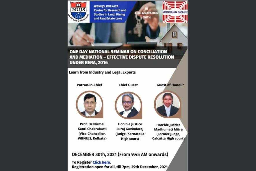 Hon’ble Justice Suraj Govindaraj Sir, Judge, Karnataka High Court will be joining the seminar as the Chief Guest. Hon’ble Justice Madhumati Mitra, Former Judge, Calcutta High Court will be the ‘Guest of Honour’. Shri Ajoy Mehta (Chairman Maharashtra RERA), Shri Ravindra Dutt, (Conciliator Consultant UP RERA & Former PCS), Shri Tariq Khan (Registrar, International Arbitration and Mediation Center, Hyderabad), Dr Niranjan Hiranandani (Vice Chairman, National Real Estate Development Council), Shri Nandu Belani (President, CREDAI Bengal), Shri Pranay Lekhi (Legal Advisor (International Arbitration), Allen & Overy, London) and many more dignitaries will be joining us as guest speakers.