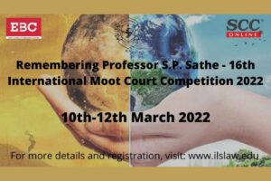 ILS Law College Pune announces the 16th International Moot Court Competition 2021-2022 in memory of Prof. SP Sathe, to be held from March 10-12, 2022. The 16th National Moot Court Competition 2021-2022 aims at equipping the students with the understanding of the nuances of international law, climate law, and humanitarian law, particularly when it comes to dealing with conflicting interests of state and non-state actors as regards the welfare of the people.