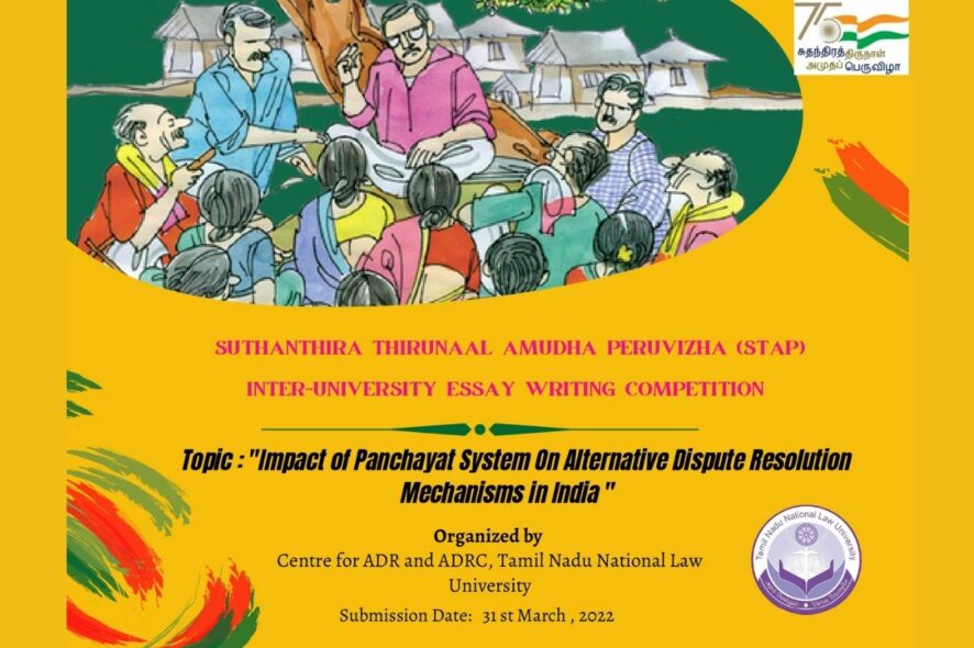 The Tamil Nadu National Law University is pleased to announce the Inter-University Essay Writing Competition jointly organized by the Centre for ADR and ADRC of Tamil Nadu National Law University as a part of Azaadi ka Amrit Mahotsav which is being celebrated as Suthanthira Thirunaal Amudha Peruvizha (STAP) in Tamil Nadu.