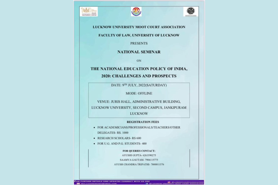 For on-spot registration the same can be submitted in person at the venue – Juris Law Hall, New Campus, Jankipuram, University of Lucknow, Lucknow to the concerned registration authority on the date of seminar i.e. 9th July, 2022. Rs.100 will be charged extraon the above mentioned fees for On the spot Registrations.