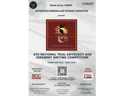 The 8th National Trial Advocacy and Judgment Writing Competition 2022-23 shall be held from 23rd to 25th February 2023 in CHRIST (Deemed to be University), Bangalore Central Campus. It will be held offline.