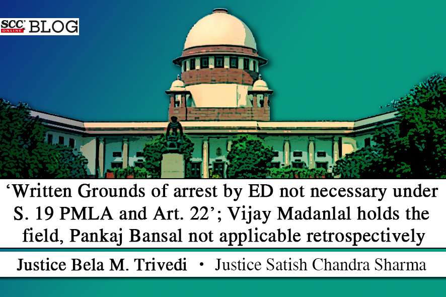 Supreme Court: While hearing a criminal appeal against the Delhi High Court’s decision whereby the accused person’s petition seeking declaration of his arrest by Directorate of Enforcement (‘ED’) as illegal and violative of the fundamental rights and to release him, the Division Bench of Bela M. Trivedi and Satish Chandra Sharma, JJ. held that the action of informing the person arrested about the grounds of his arrest is a sufficient compliance of Section 19 of PMLA as also Article 22(1) of the Constitution of India, as held in Vijay Madanlal Choudhary and Others vs. Union of India (2022) SCC Online SC 929 and it holds the field.