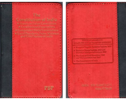First launched in 2009, EBC’s Coat-Pocket Constitution was an innovation in legal publishing designed as a portable with a signature red-and-black trade dress, a specific font style and layout, gold leafing and embossed detailing and publication on thin bible paper. Over the years, it has become one of EBC’s most iconic and best-loved publications, trusted by judges, lawyers, students, and even public figures. Now in its 17th edition, the Coat-Pocket Constitution continues to be the plaintiffs’ flagship product, enjoying immense goodwill, reputation, and recognition in the Indian legal market. The image is as follows: